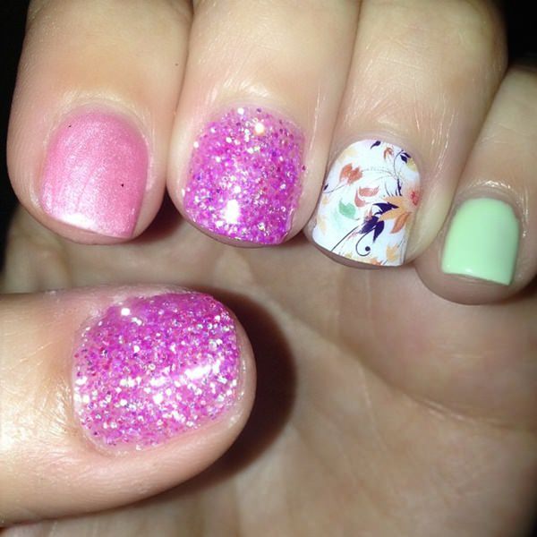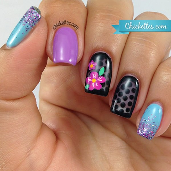 1. Who says you have to choose just one look. Take this set for example, the girl has used a different look for each nail showing off here truly creative side. Add a little sparkle, flowers or even some dots and have some fun with your look.