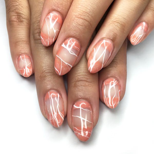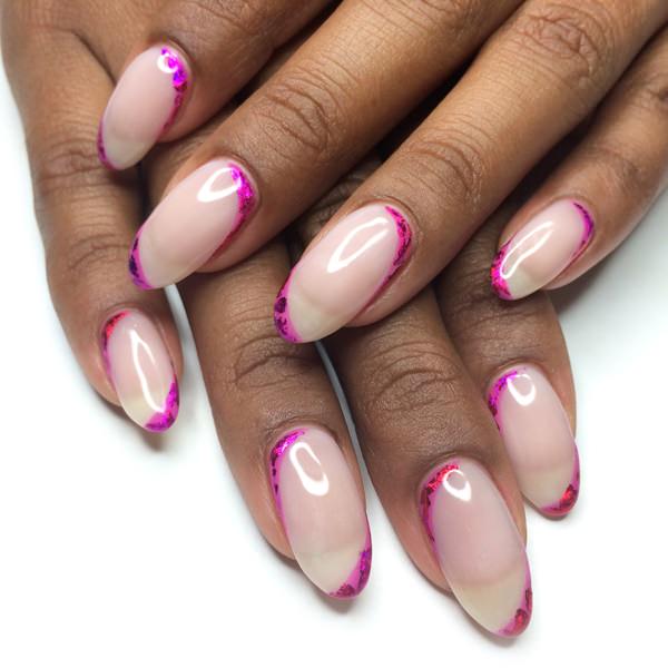 1. Using the pointed edge of the gel nails for this look you can create an unique design by adding a touch of color along the curves of your nails. Bright pink against a pale pink background is a truly beautiful look.