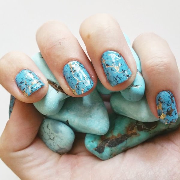 1. This beautiful re-creation of stones will surely have your friends talking about your gel nails for weeks. The beautiful blues complements the gold and black accents throughout the nail.