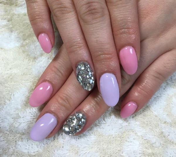 1. This long look pairs pastels with some serious bling. The colors all work together beautifully and the bling look is achieved as a 3-D design with layers of gems to cause a look that will draw people to your nails immediately.