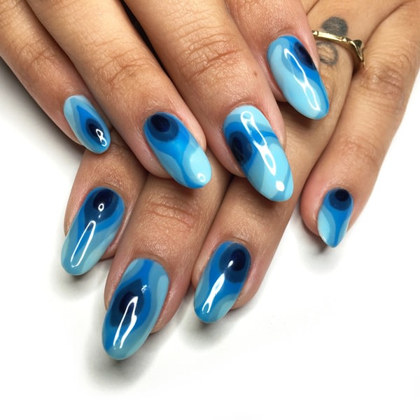 1. These blue gel nails resemble the blue looking eye. It’s a beautiful way of keeping a positive eye with you at all times. The different shades of blue really bring the look together leaving you with a stunning design.