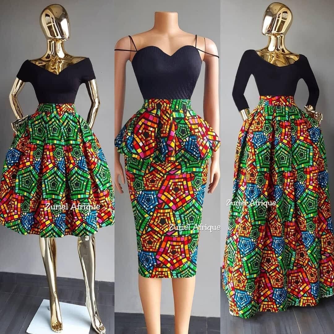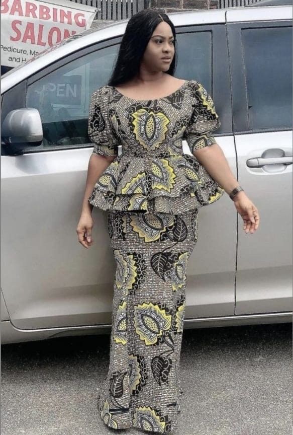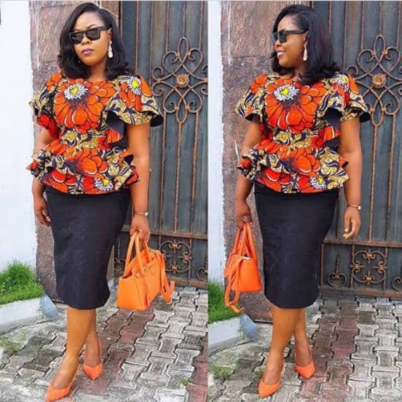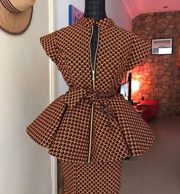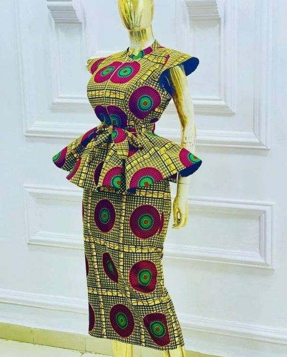 - Style: A fitted Ankara blouse with a peplum waist paired with a straight, knee-length or midi skirt.