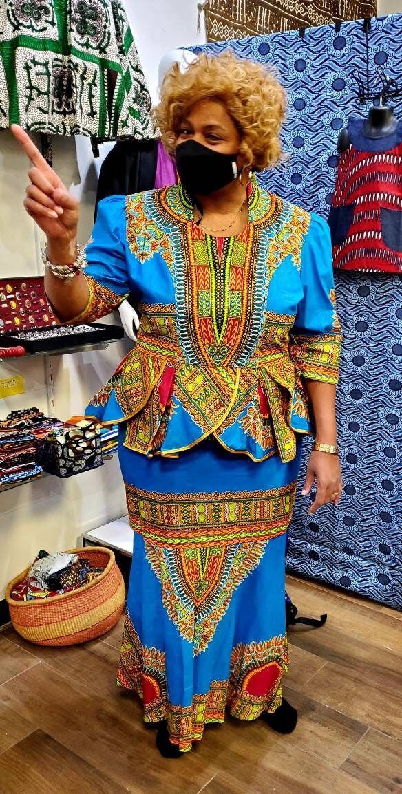 - Style: An Ankara wrap skirt combined with an asymmetric-cut blouse.