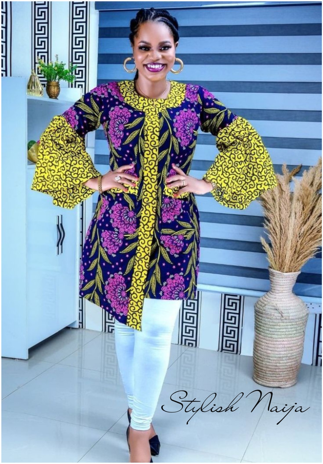 Trending and fascinating Ankara blouse styles can significantly enhance the look of your jeans or trousers, adding a vibrant and unique touch to your outfit. Here are some of the latest Ankara blouse styles that are making waves in the fashion world and would pair wonderfully with your favorite jeans or trousers: