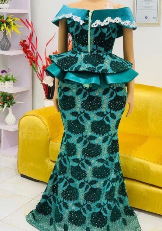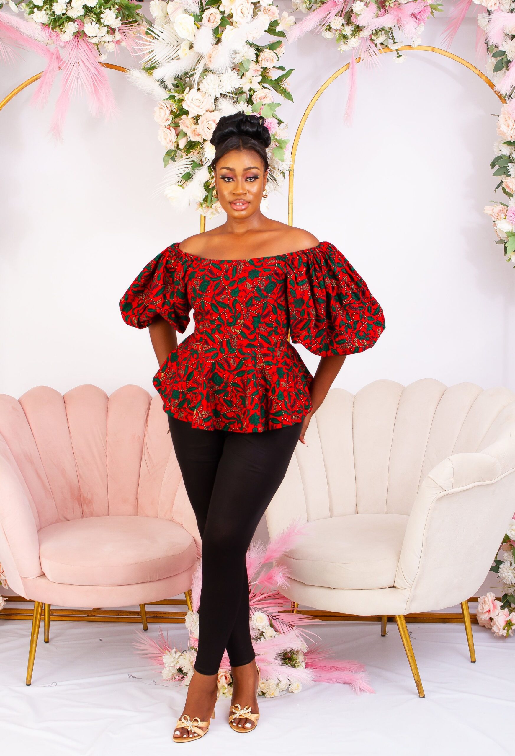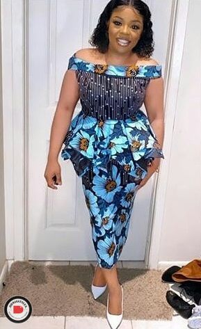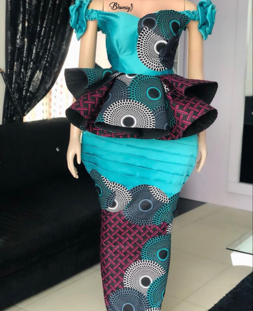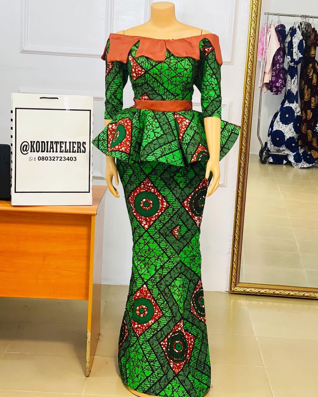 3. Off-Shoulder Peplum Blouse with Flared Skirt: An off-shoulder peplum blouse paired with a flared Ankara skirt is a stunning and flattering outfit for special occasions.