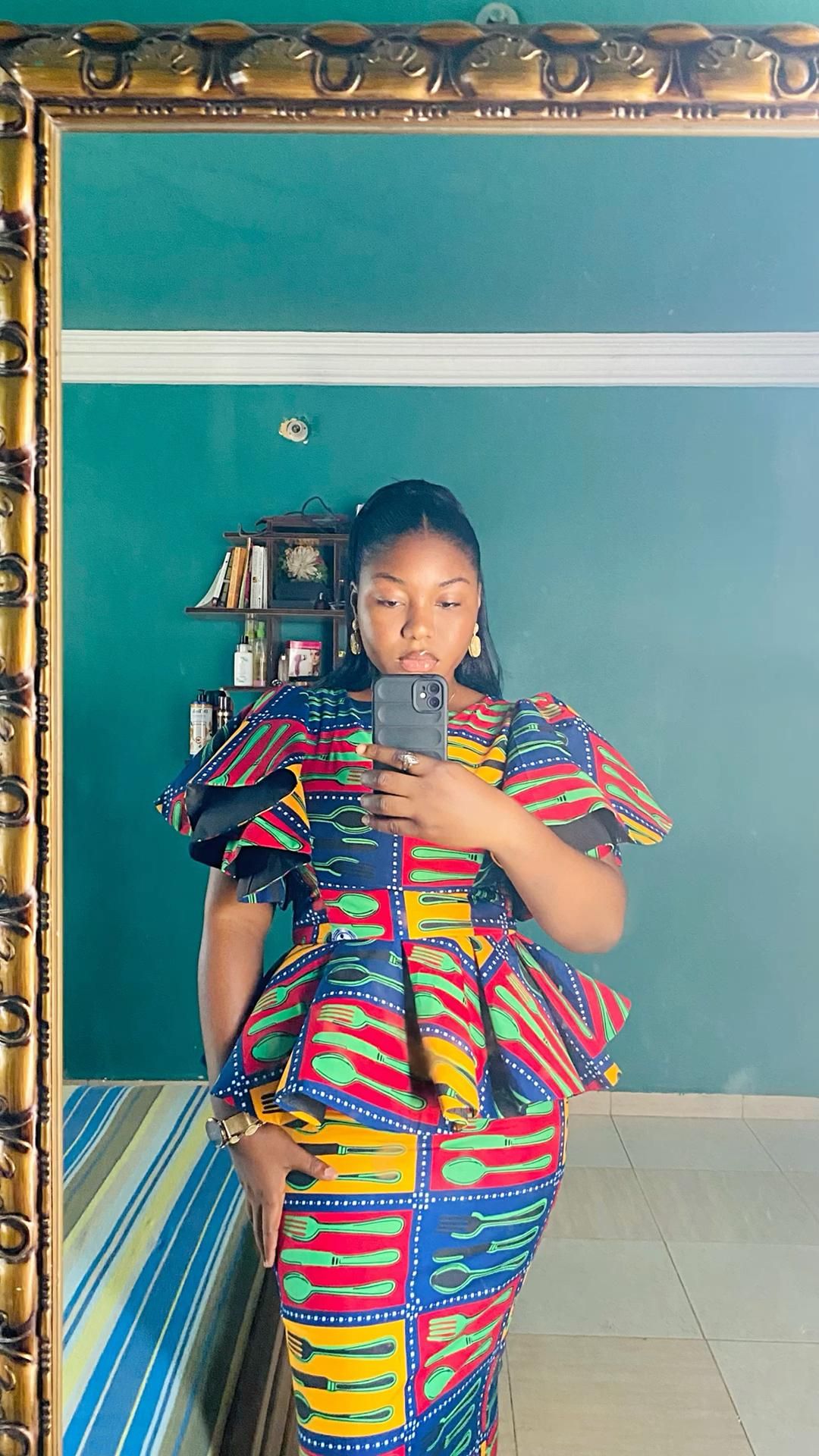 2. High-Low Peplum Blouse with Ankara Midi Skirt: A high-low peplum blouse adds a modern twist to the traditional peplum style. Paired with a midi skirt in matching Ankara fabric, it creates a stylish ensemble.
