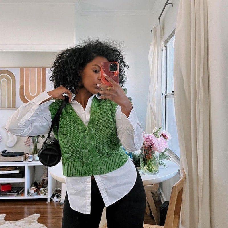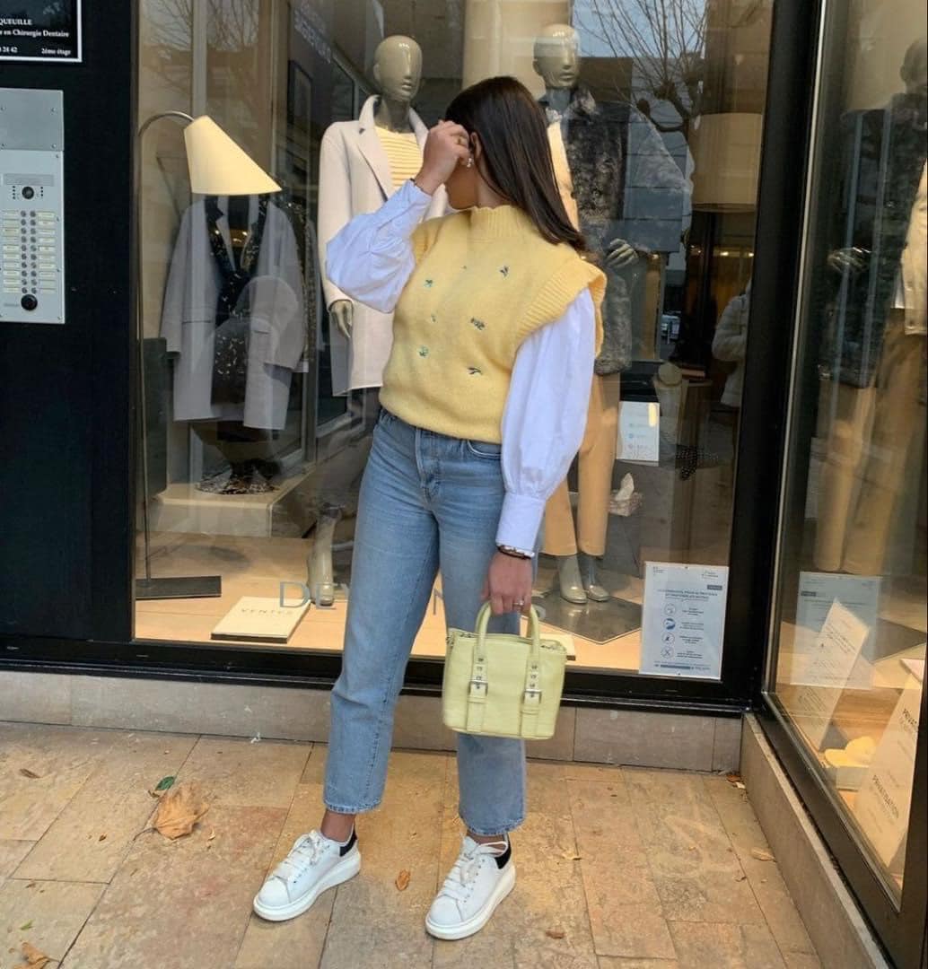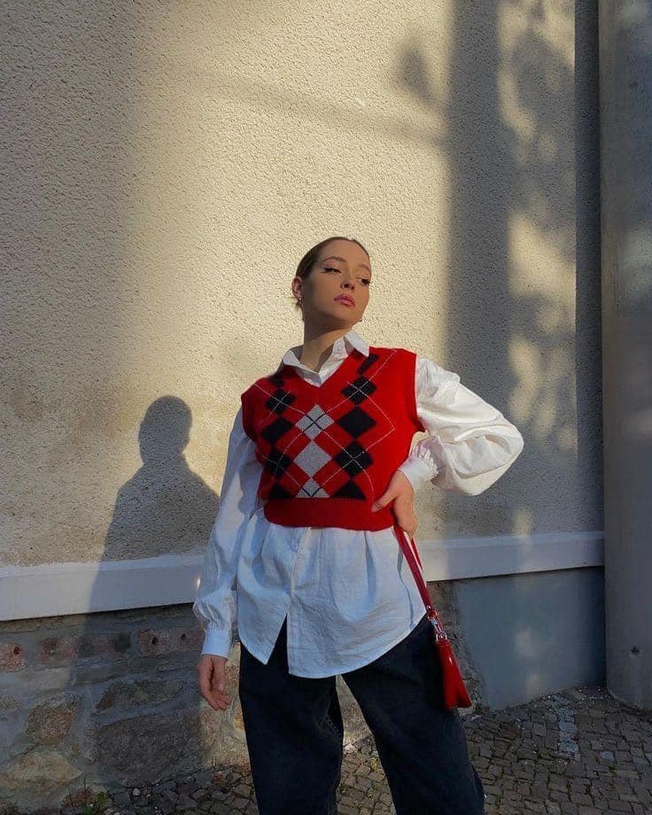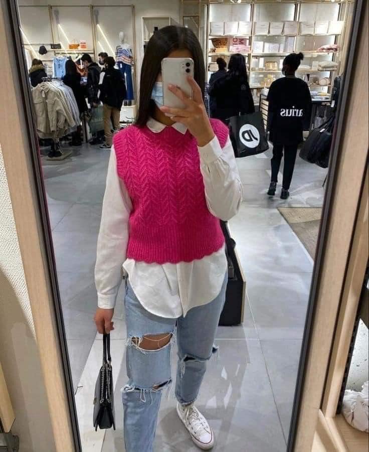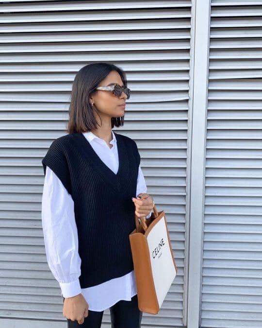 - Outfit: Pair a crisp white button-down shirt with a V-neck sweater. Choose a sweater in a neutral color like black, navy, or grey for a classic look, or opt for a bold color to make a statement.