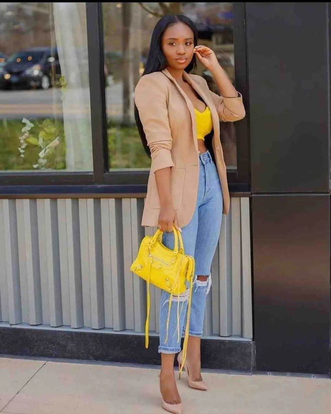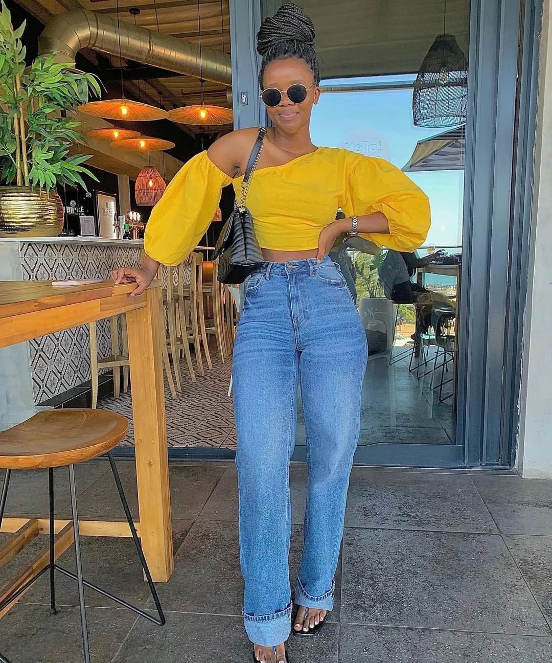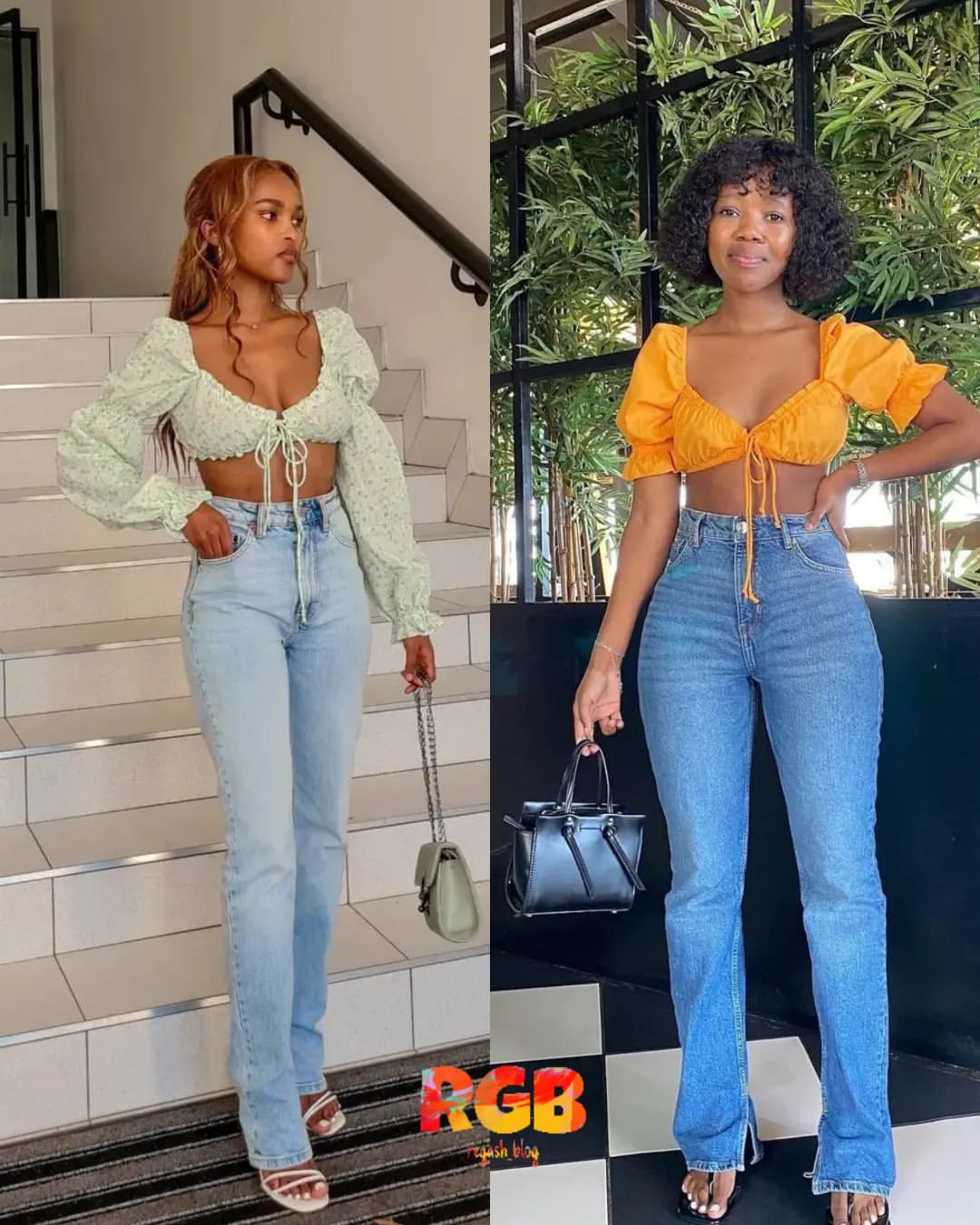2. High-Waisted Jeans and Crop Tops: Combine high-waisted jeans with a crop top for a trendy and youthful appearance. This look works great for casual outings and can be accessorized with statement jewelry.
