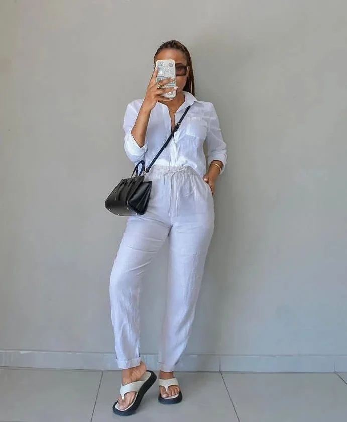 Wide-leg pants paired with a fitted top create an elegant and comfortable outfit suitable for various weekend activities.